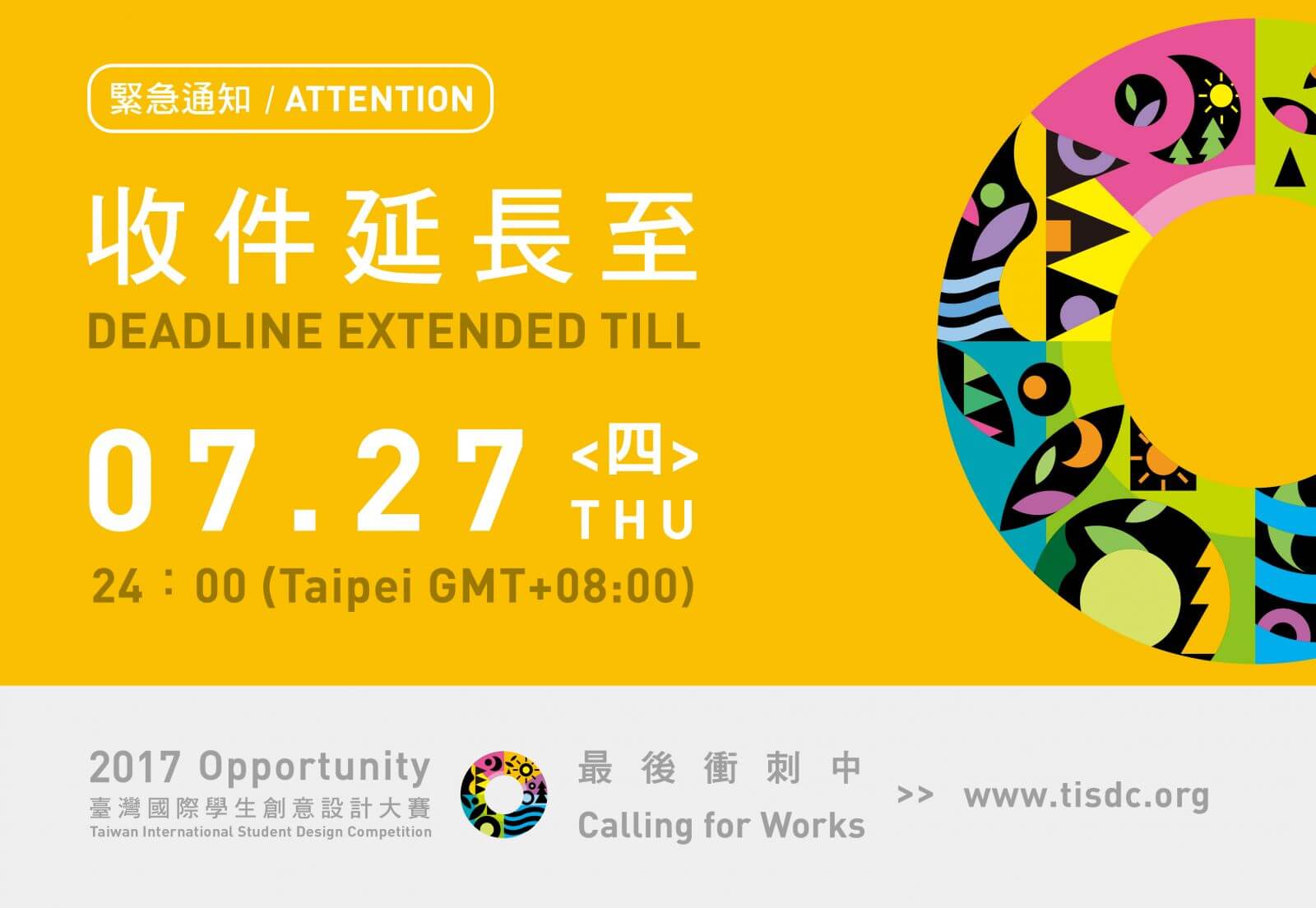 【緊急公告】2017臺灣國際學生創意設計大賽延長收件時間至7/27(星期四)24:00(GMT+8:00)!