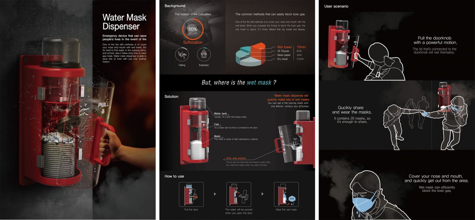The jury of final selection is unanimous as to the reason why the awards-winning designs stand out from all other entries, that is to say, the awards-winning works are high-quality designs with a variety of styles and international perspective. This year, the Water Mask Dispenser from product design category seized the Grand Prix. Hyunsu Park, Hyungjun Koo, Jaeyon Kim, Seonggon Jin, Minseop Woo, Hanna Lee, Chanmi Kim, and Wansik Jang are the students who came up with the award-winning design. The Water Mask Dispenser can be used as an emergency gear in fire scene. Whenever a fire occurs, even if there is no source of water on the spot, the mask can filter the poisonous smoke in fire. In short, the design is simple and can be easily operated. It saves lives at critical moments. When disaster happens, the Water Mask Dispenser provides opportunities for evacuees to survive. It fits the theme “Opportunity” perfectly, thus, it has won heart of most juries.
