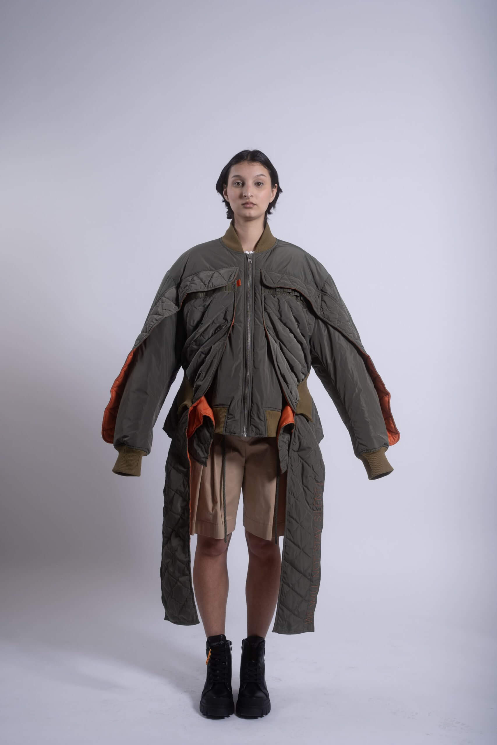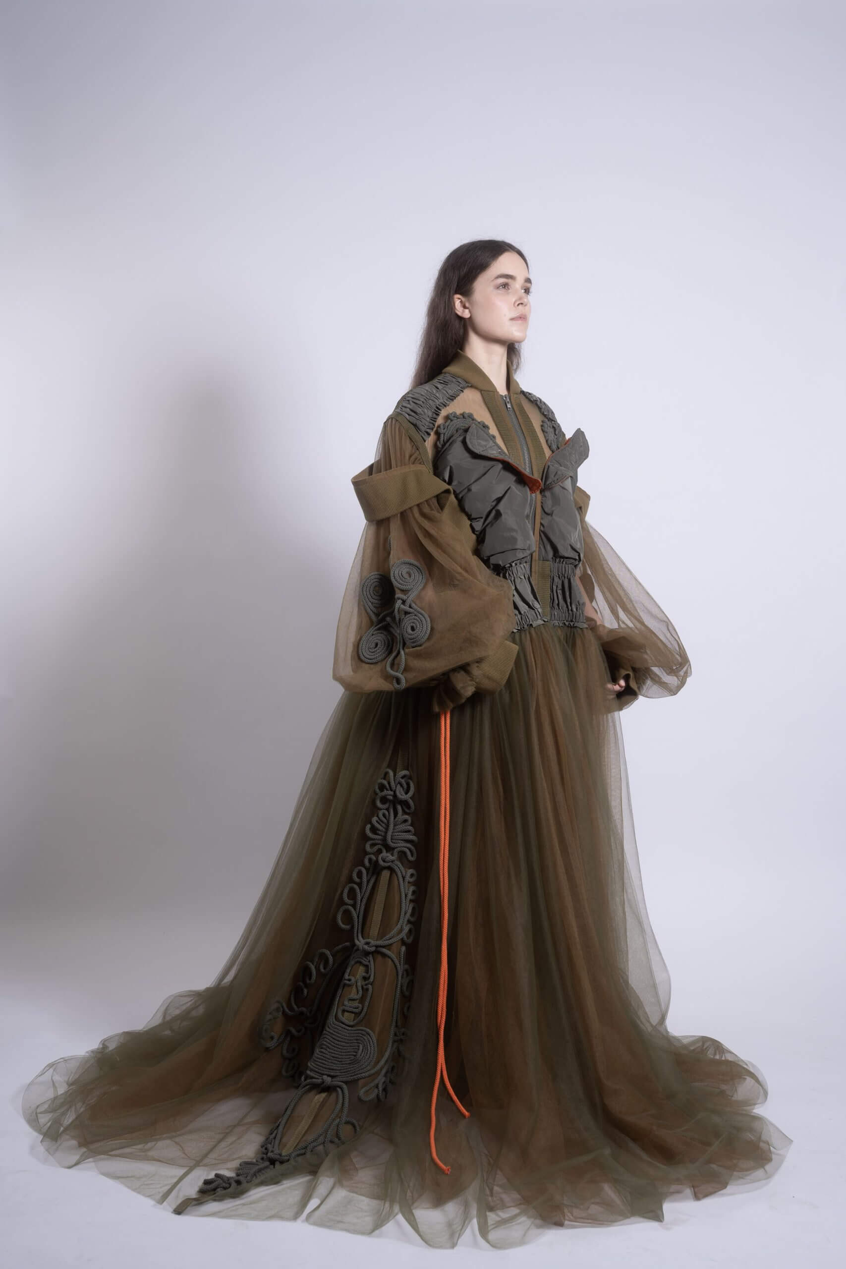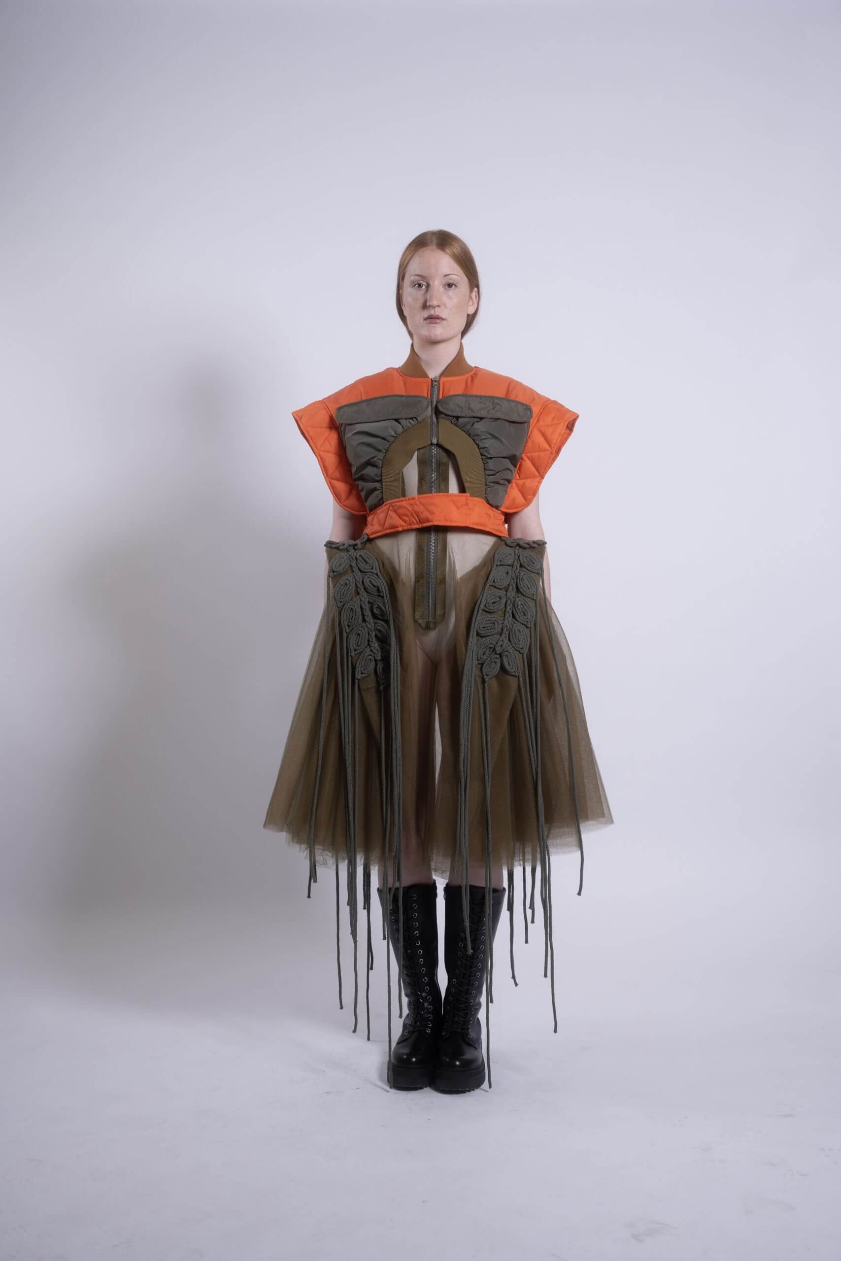 This collection explores how Afghan women use fashion and symbols to express identity and resist oppression. Traditional and political motifs, combined with experimental techniques like deconstruction and grid cutting, transform classic garments into hybrids. The robust jacket symbolizes protection and strength, while the flowing dress embodies femininity, resilience, and the fight for freedom. It is a tribute to the courage of women like Maryam, who keep fighting despite losing everything.