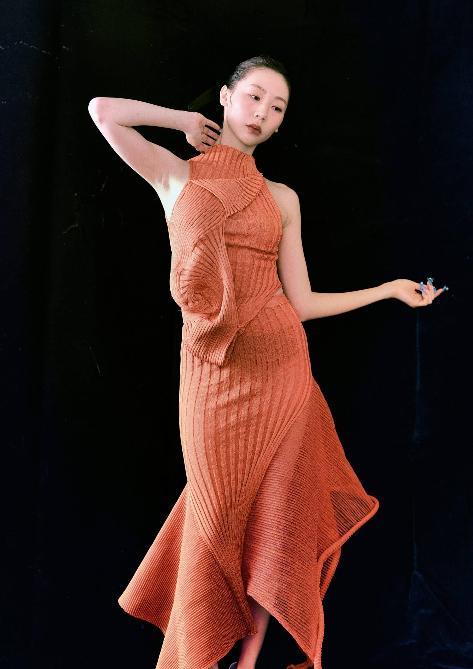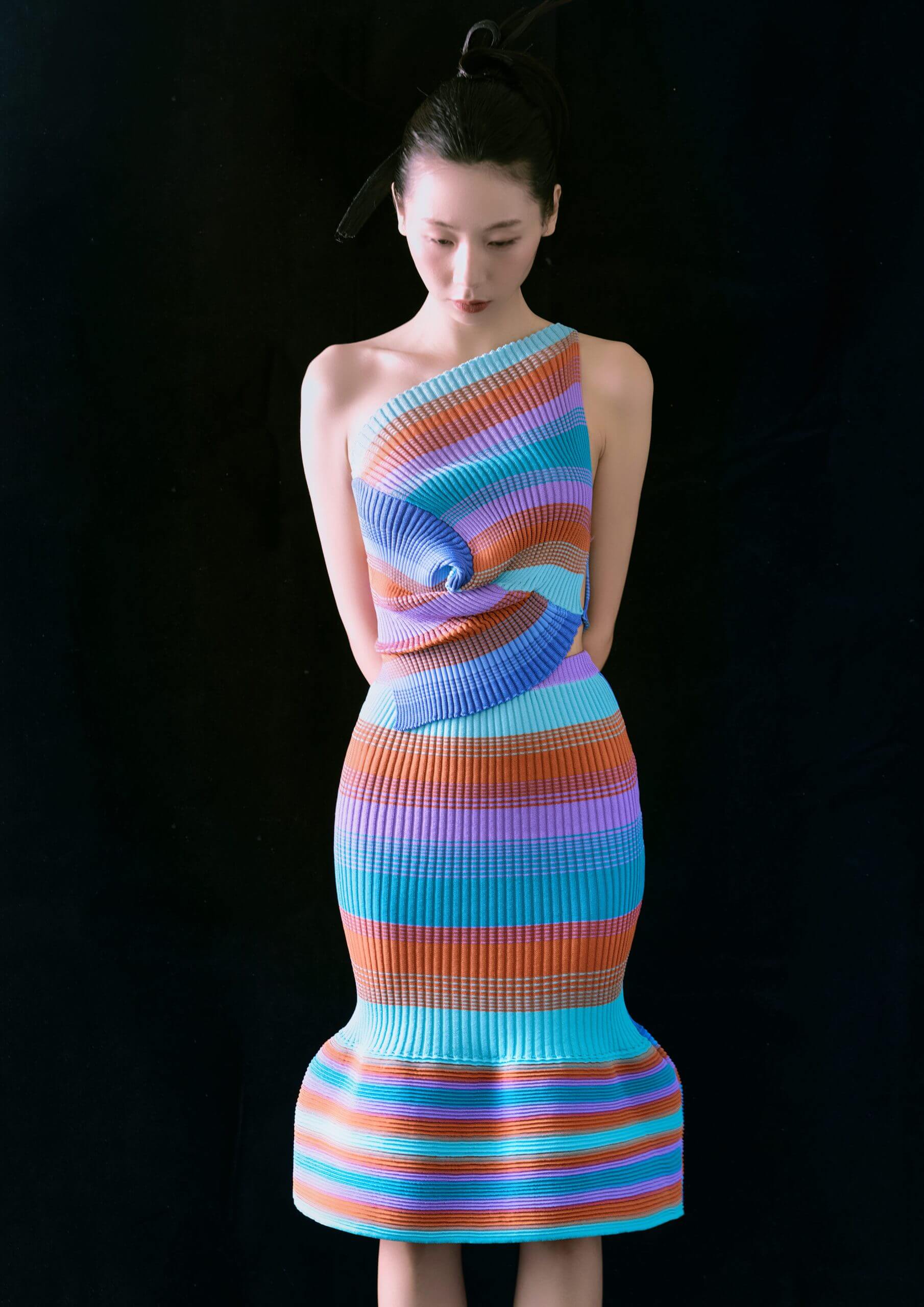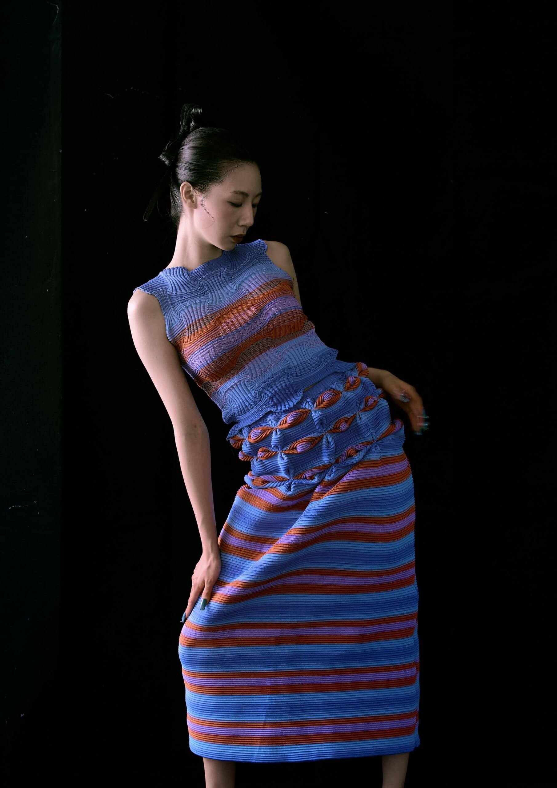 This collection uses color blocking and dislocated arrangements to evoke the ever-changing, psychedelic visuals of a kaleidoscope in motion. Centered on ribbed knits, each piece is shaped entirely through structural techniques. The design highlights the close fit between ribbing and the body, tracing the natural curves of the female form to express strength through softness. Blending color, texture, and structure, the collection presents visually striking yet wearable contemporary womenswear.