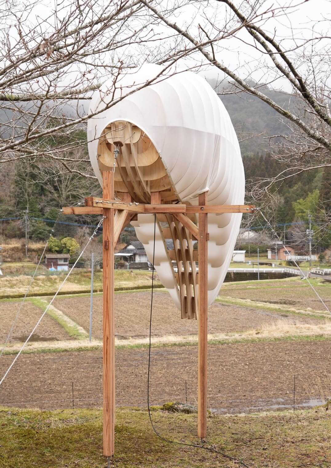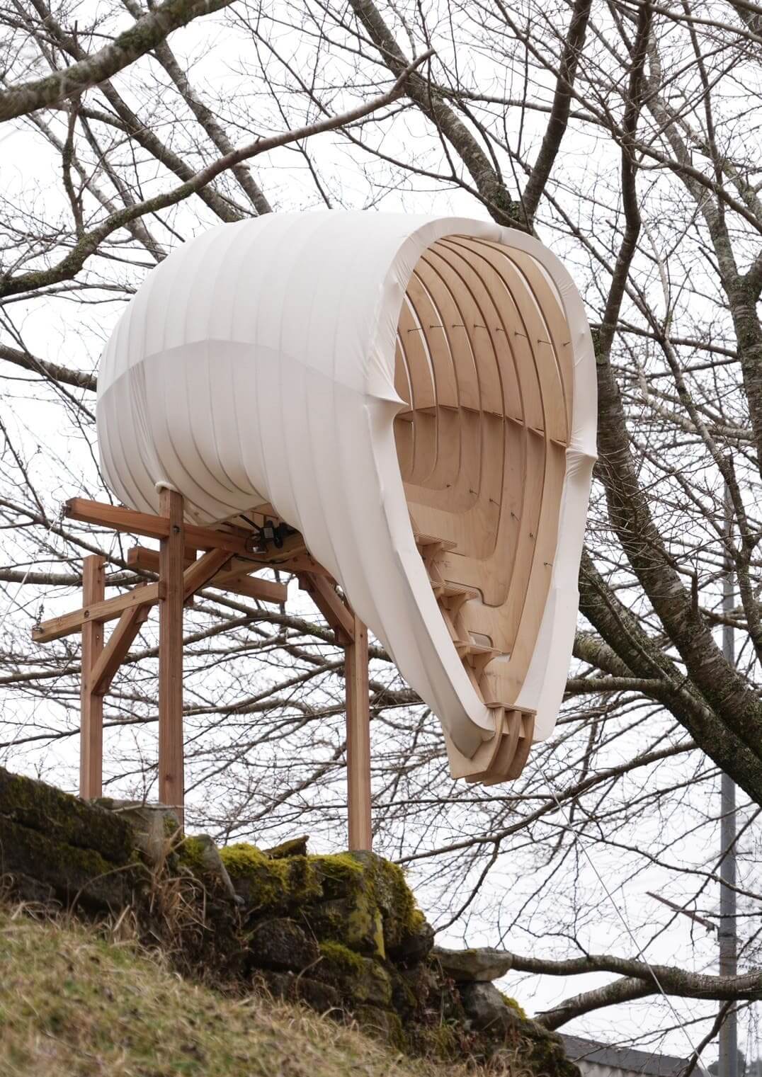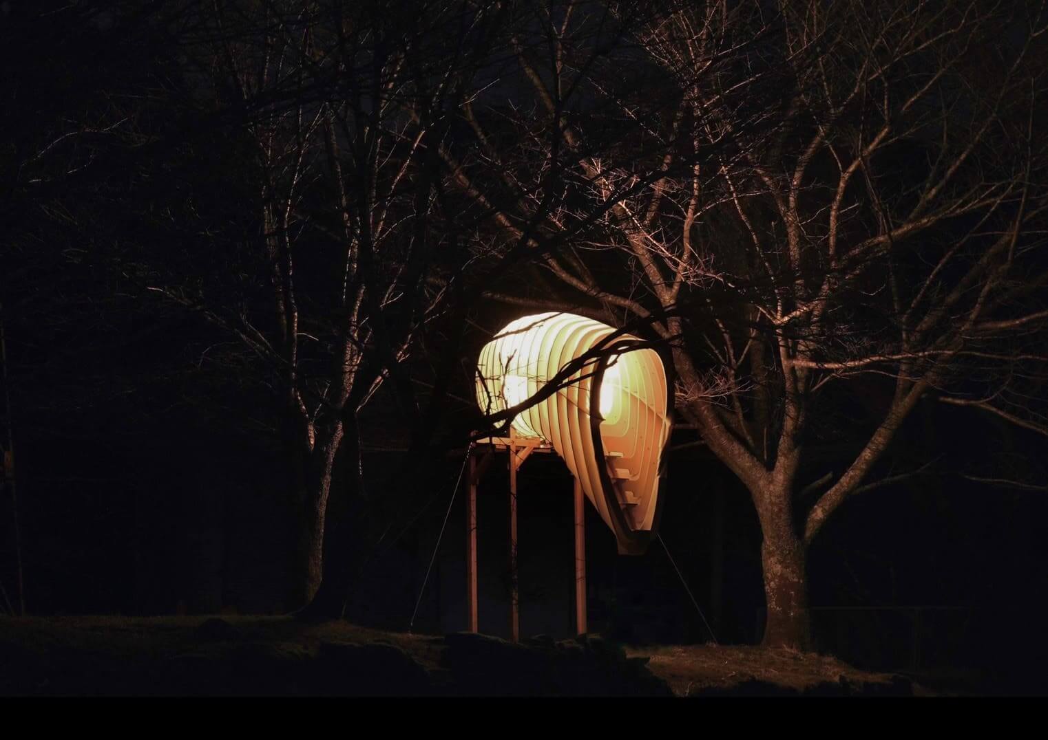 This installation designed for Beitou New Village is located on the wall at the entrance of the village’s public bathhouse. The purpose is to allow people who sit in it and listen to the gurgling sound of hot spring water to evoke memories and imaginations of the former military dependents’ village. The installation is in the shape of a pupa, symbolizing a time cockpit. And it takes our consciousness through time and space. The white appearance is like hot spring mist rising into the air.