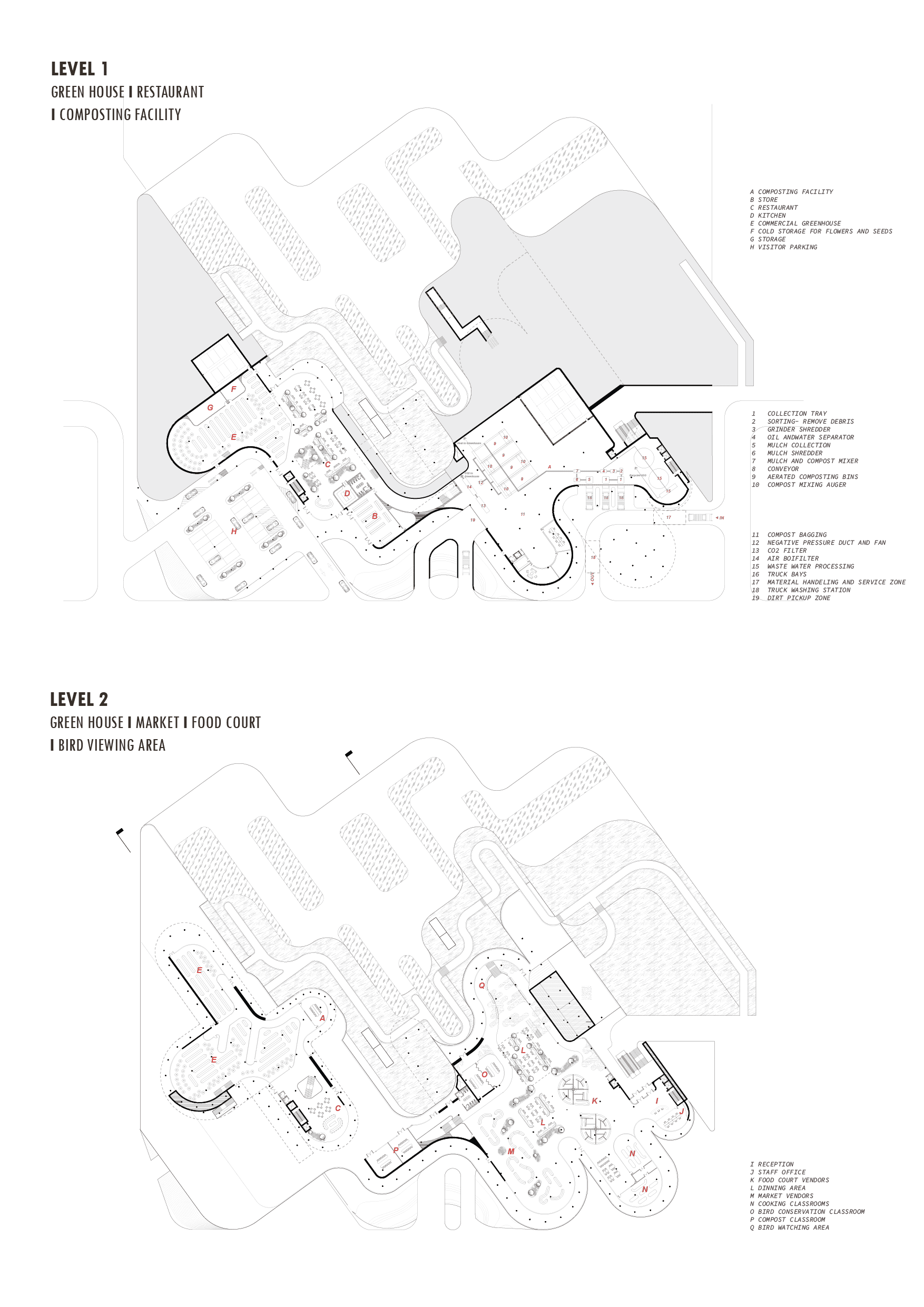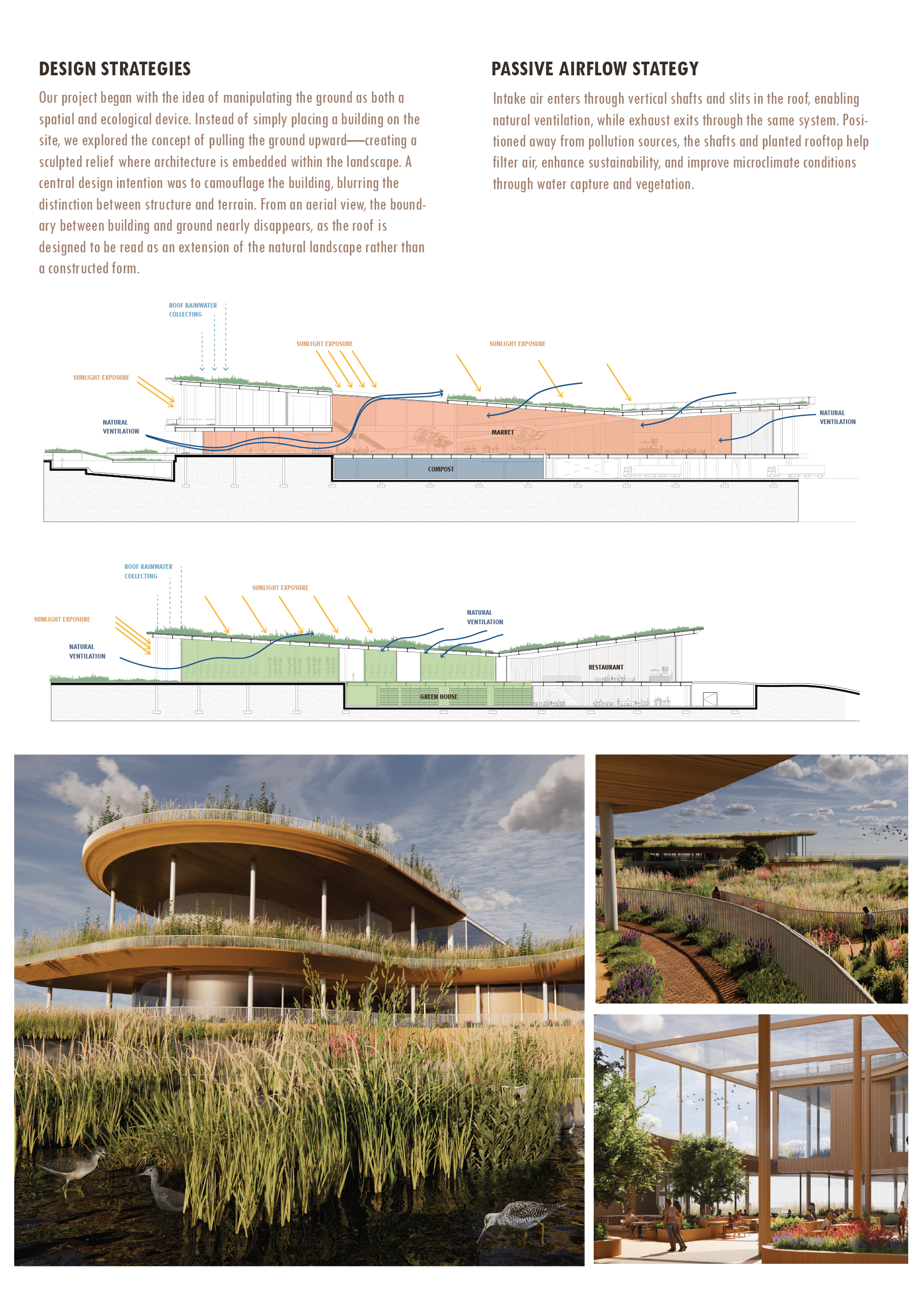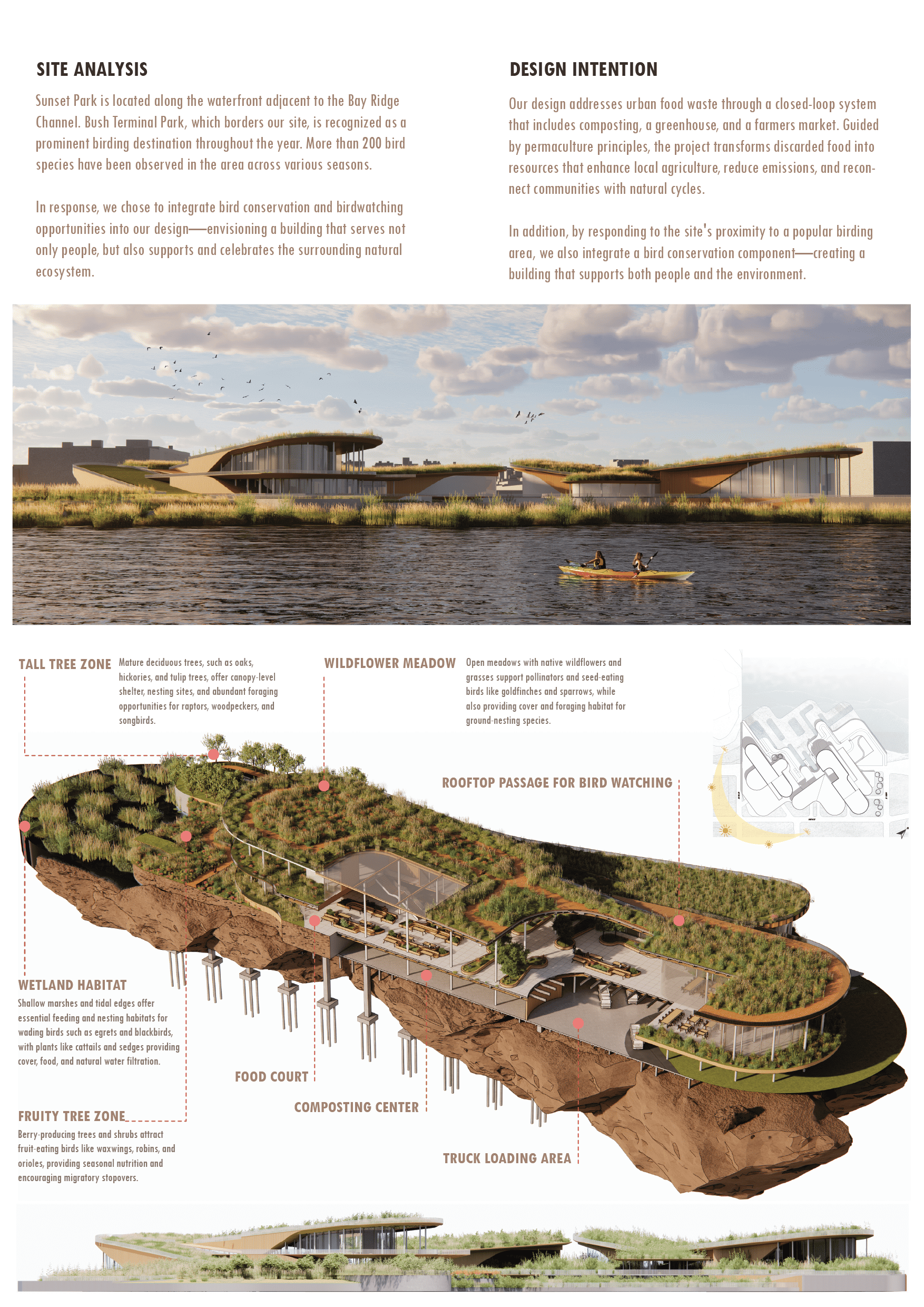Horizon Nest is a sanctuary where humans and nature thrive together through shared space and sustainable systems. The project combines composting, urban farming, a farmers market, and bird conservation into a closed-loop design. Embedded in sculpted terrain, the architecture blends seamlessly with the landscape. Rooftop vegetation, water capture, and native habitats support wildlife and enhance environmental performance—redefining the built environment as an extension of nature.