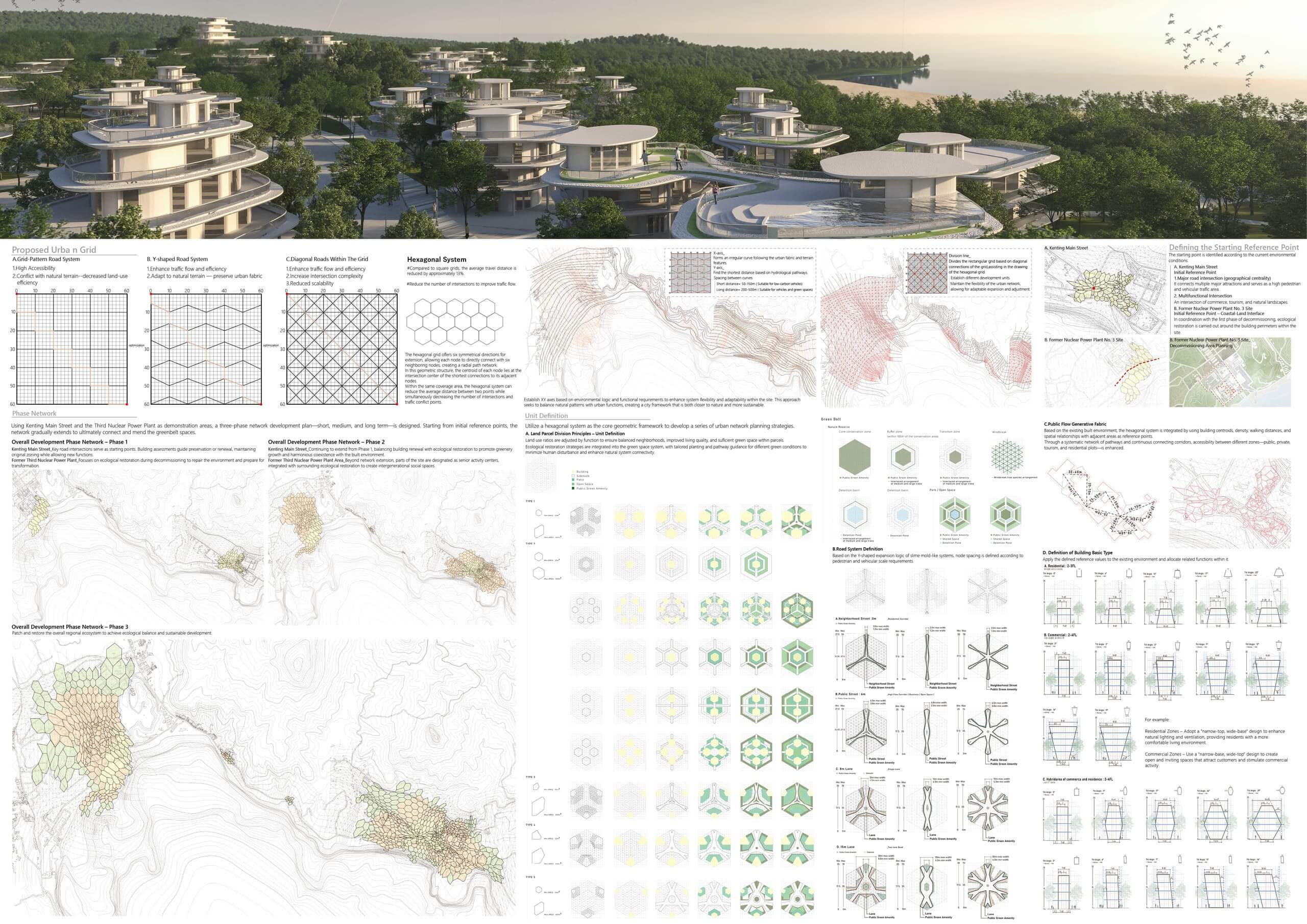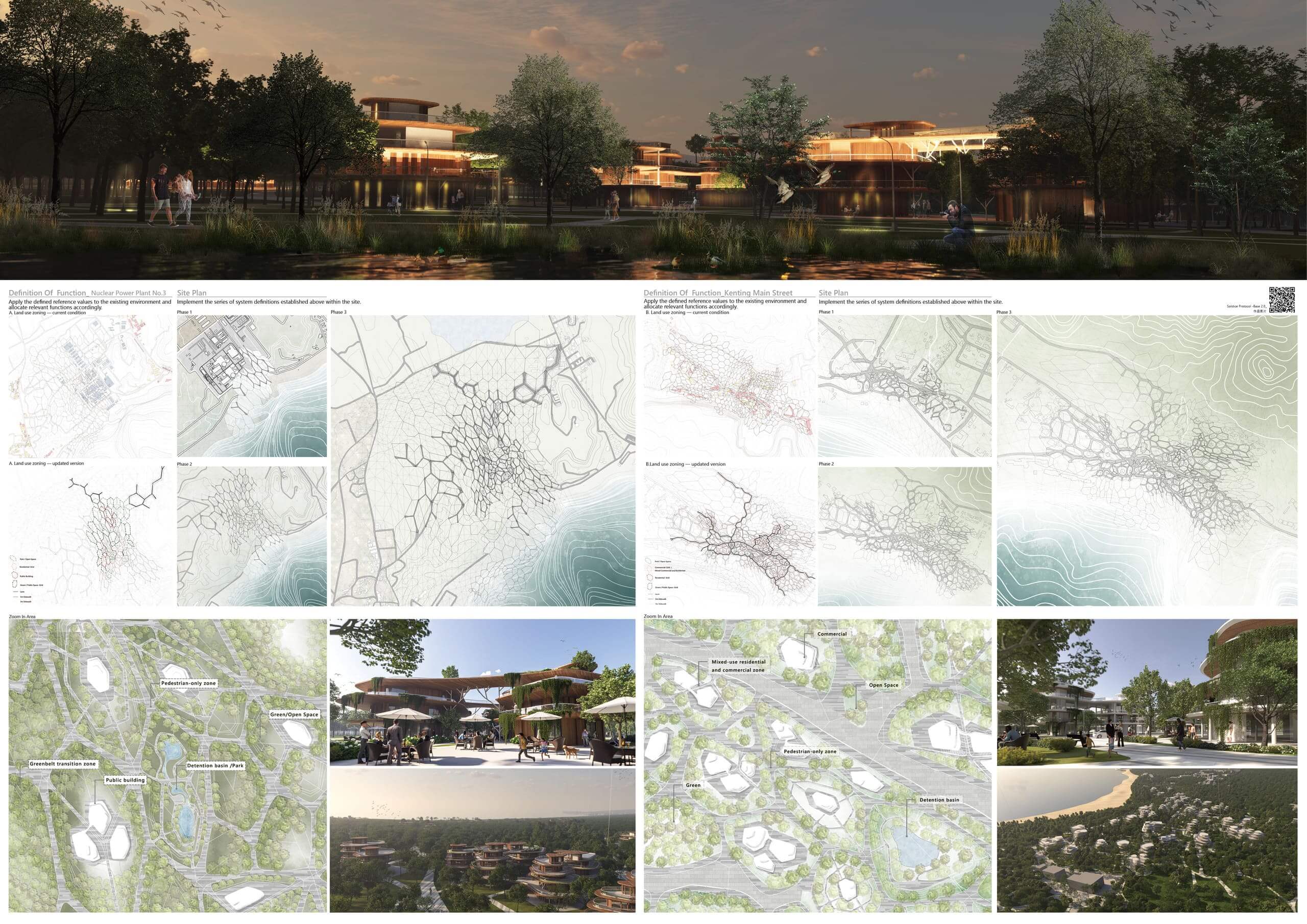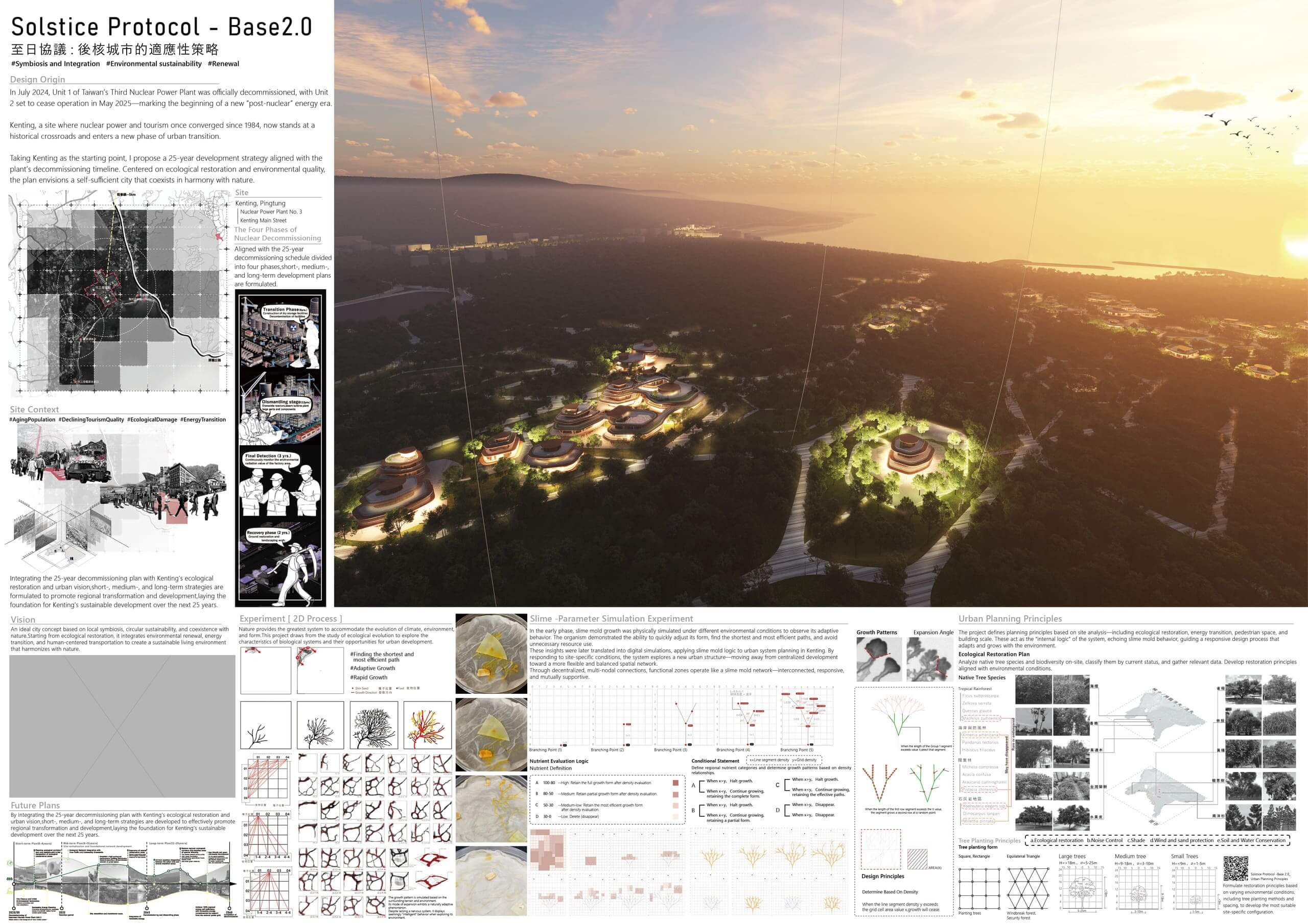 Based on biological evolution studies, this project proposes a final agreement for harmonious coexistence between humans and nature. It explores possibilities for land redevelopment following the decommissioning of Nuclear Power Plant No. 3, addressing issues such as the decline in tourism quality in Kenting, an aging population, ecological degradation, and energy transition. The design concept is founded on the vision of “redefining the future urban landscape of Kenting,” planning a resilient f