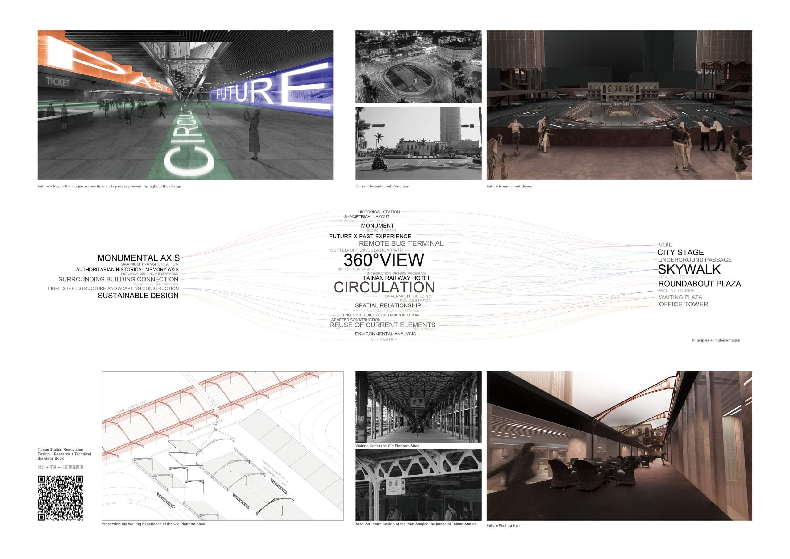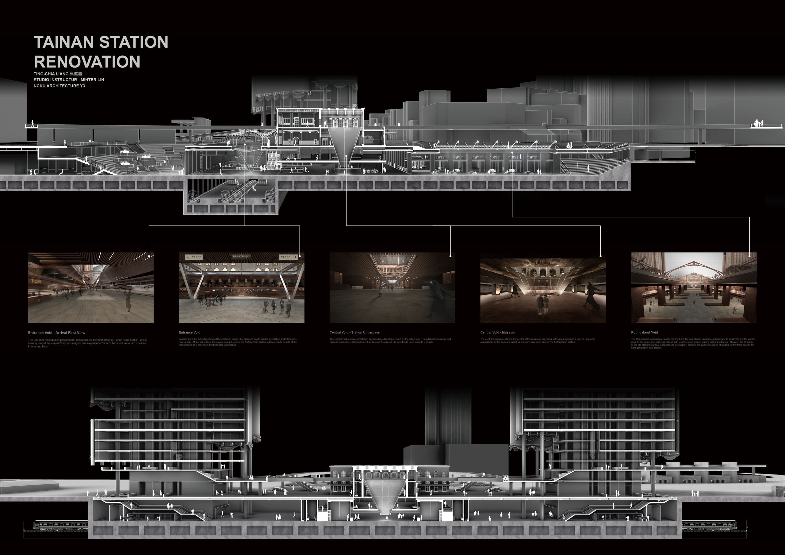 Tainan Station has undergone several restorations. The current plan retains the historic building alongside the new underground development, reflecting the city’s evolving urban fabric. The site continues to tell a story that connects Tainan’s past and future. The design challenge is to integrate transportation, land, materials, and experience with humility and precision. This project imagines a future shaped by thoughtful choices and grounded in Tainan’s enduring spirit.