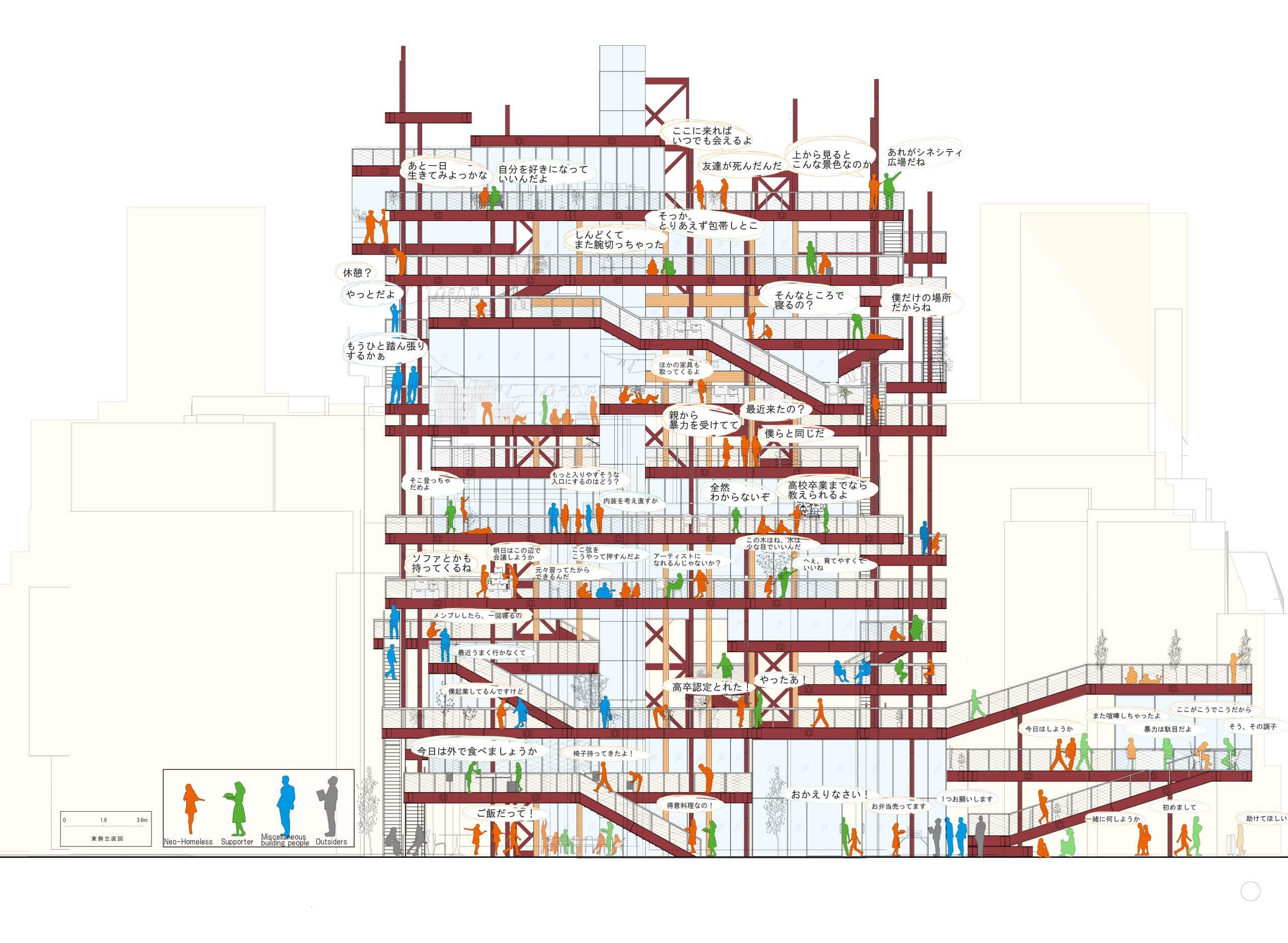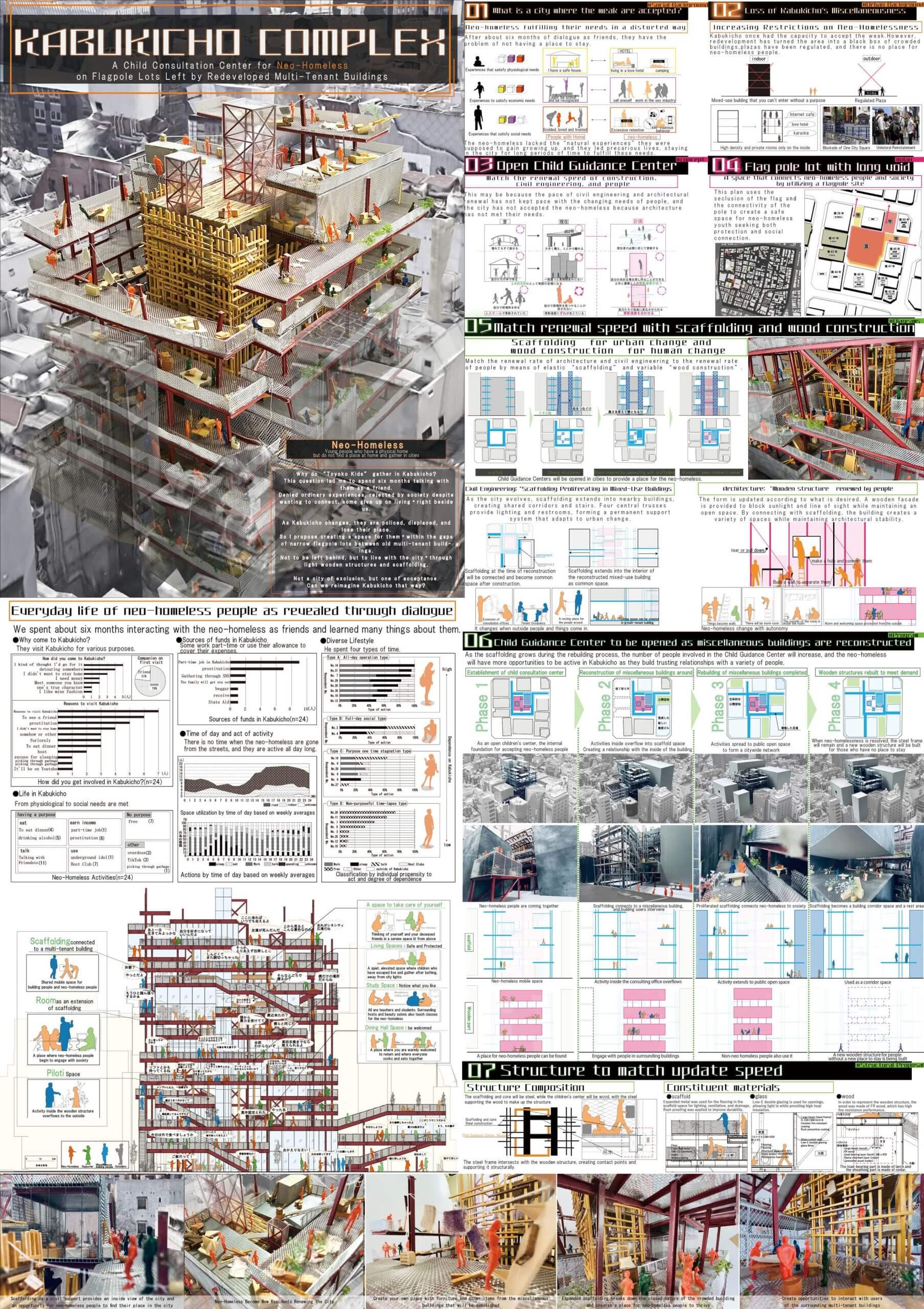 Kabukicho Complex is a welfare facility for “neo-homeless” youth in Tokyo. Based on six months of fieldwork, we found that redevelopment had erased their few places of refuge. We designed a flexible structure using wood and scaffolding. As nearby buildings are rebuilt, the scaffolding extends outward, gently connecting the youth with the city. Placed on a narrow flagpole-shaped lot, the architecture offers not just shelter, but a starting point for urban inclusion and renewal.