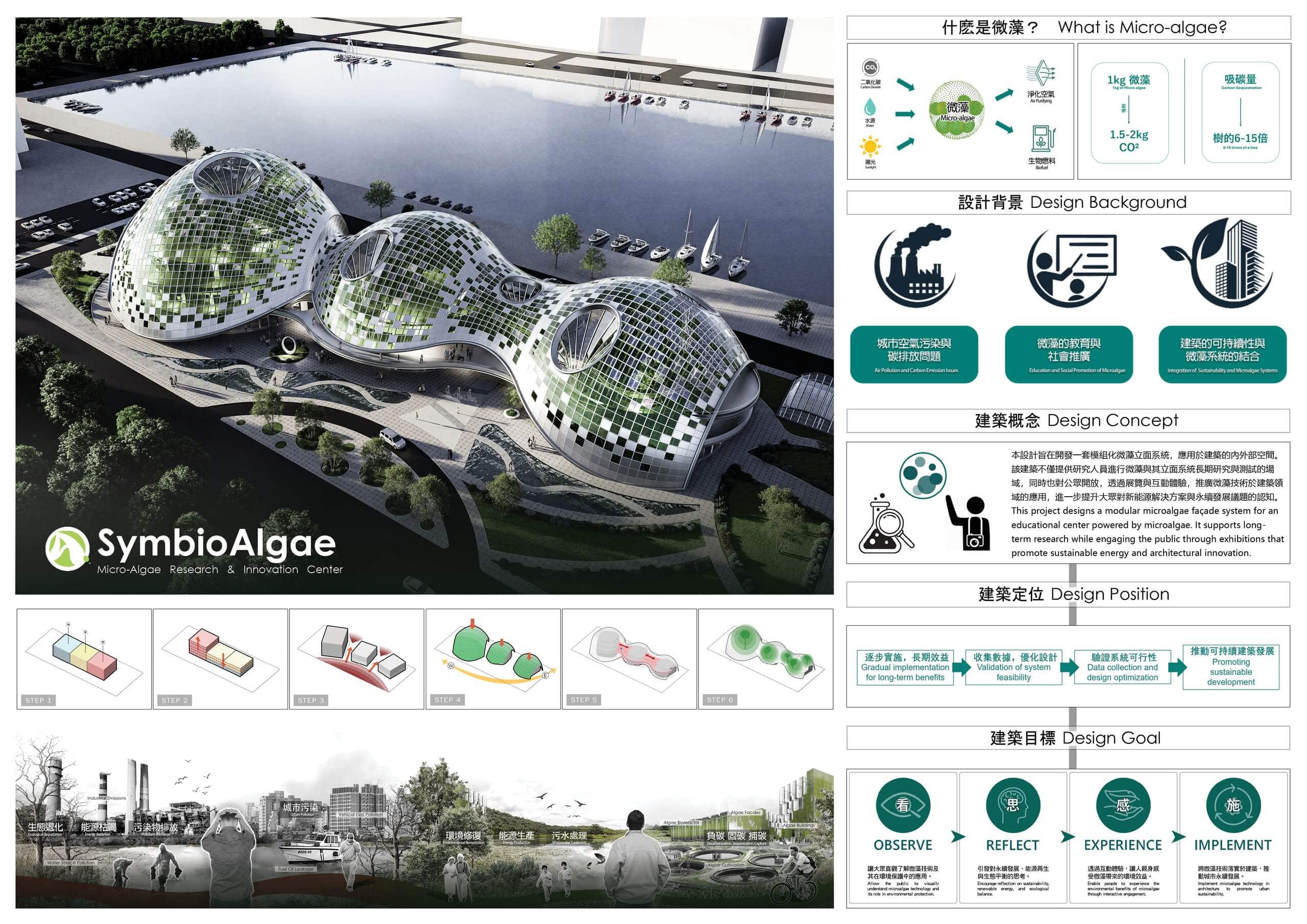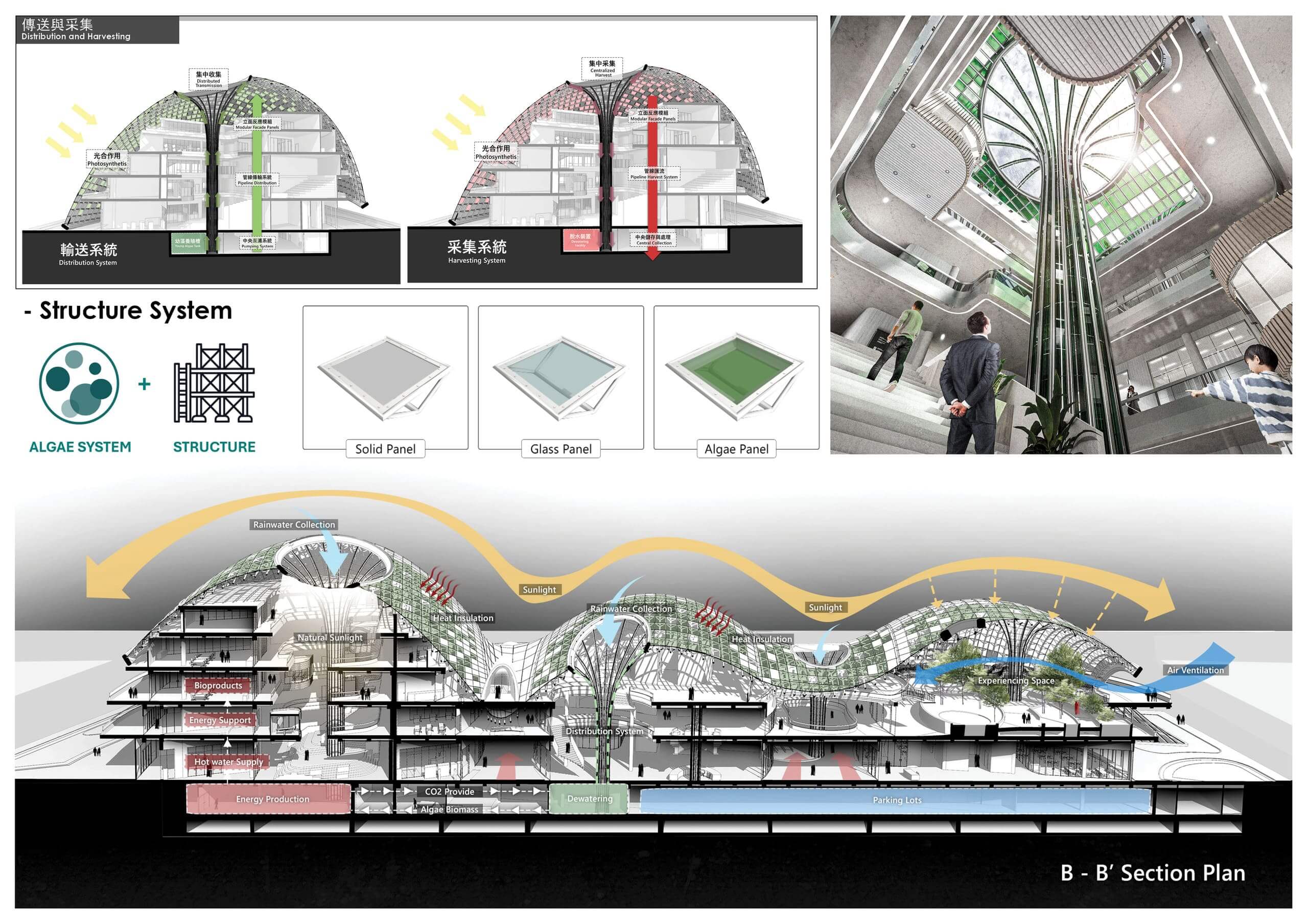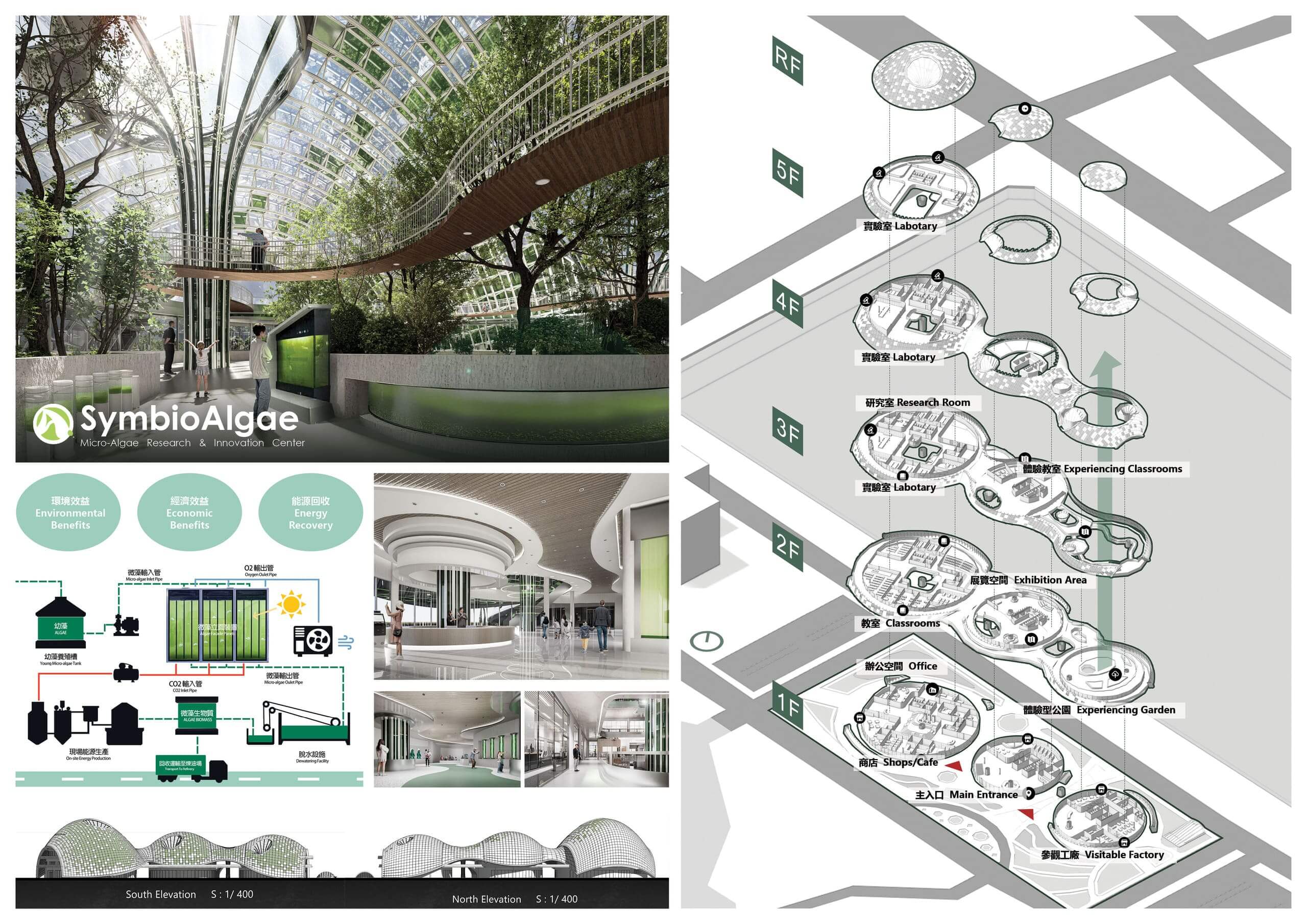“Symbio Algae” integrates microalgae technology with architecture to create a sustainable space for research, exhibition, and commerce. The building features a photosynthetic façade that absorbs CO₂ and generates energy. At its core, a “Tree of Life” system distributes and collects microalgae, organizing both energy flow and circulation. Visitors can closely observe algae growth, experiencing its potential as both a healer and energy generator, while reflecting on the symbiotic relationship betw