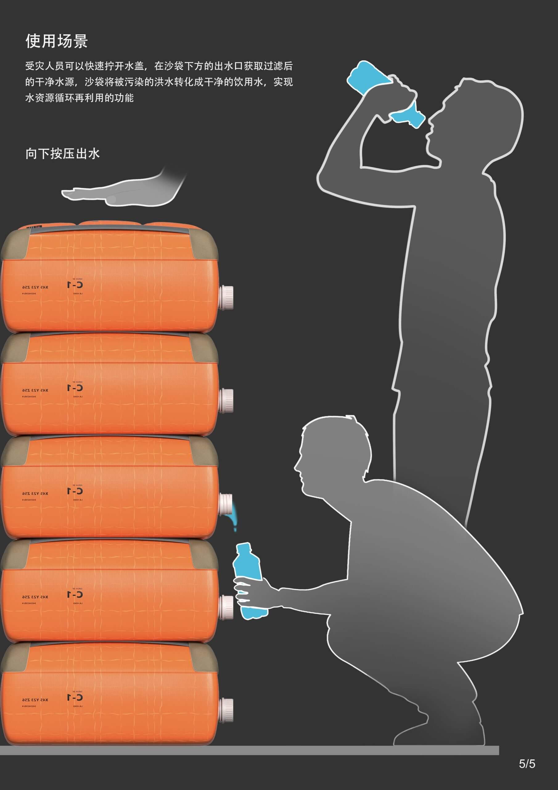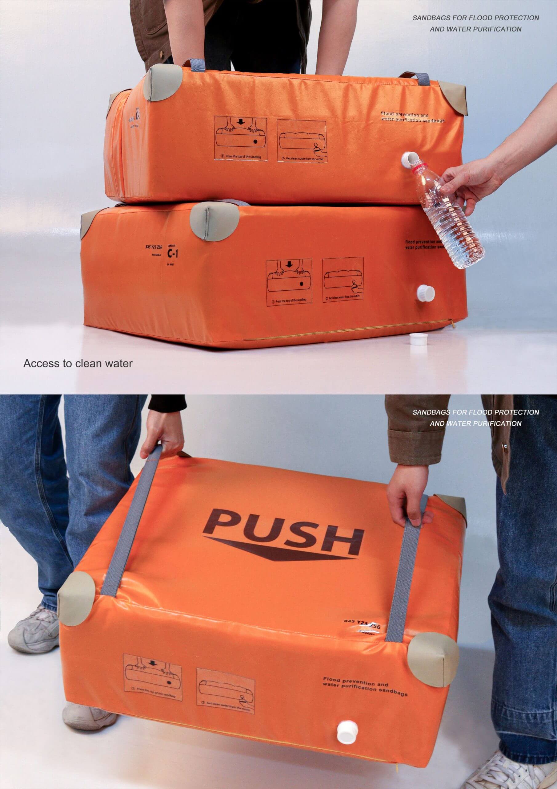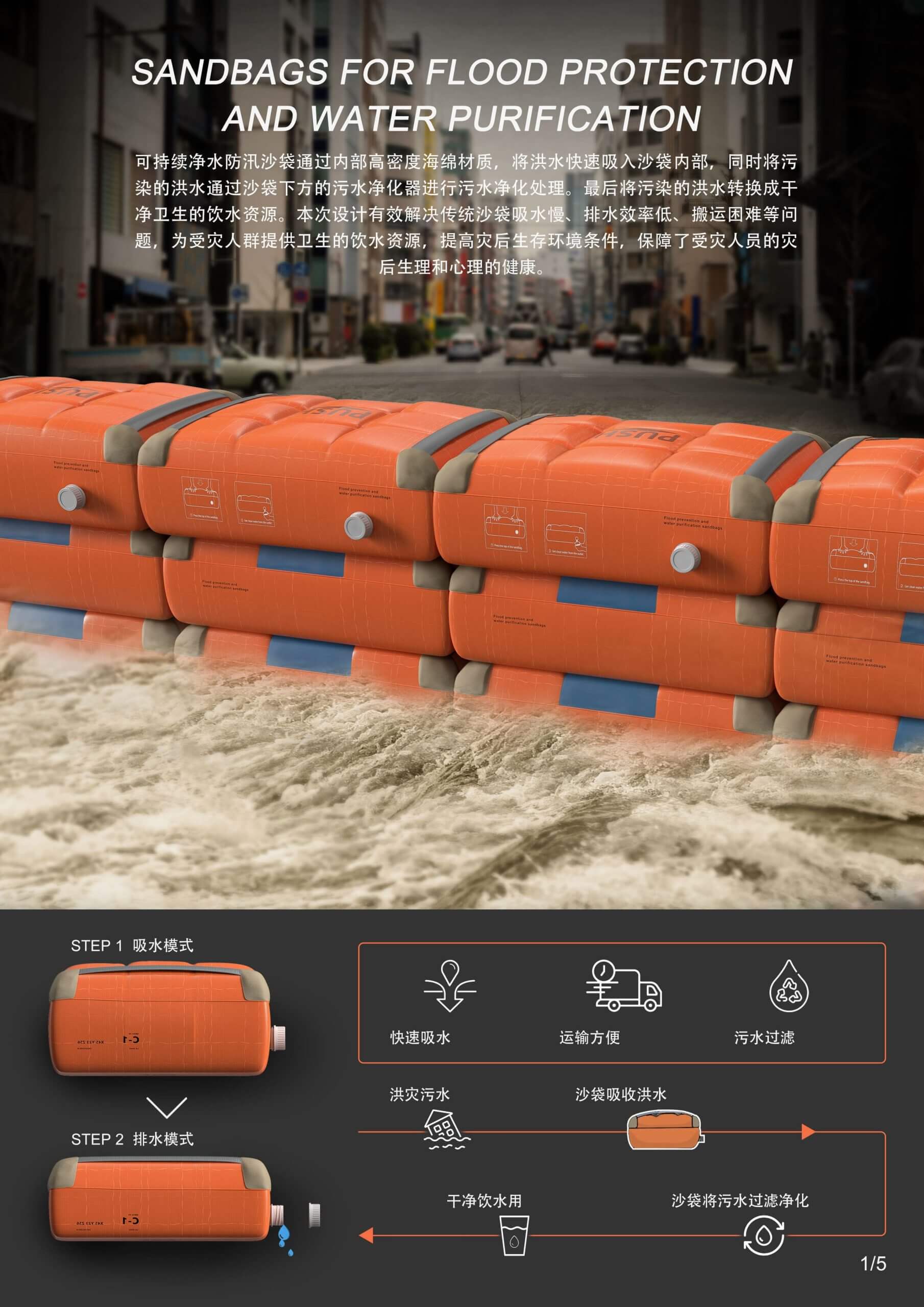 The sustainable water purification and flood control sandbag uses a high-density sponge material inside to quickly inhale the floodwater in, and at the same time, the polluted floodwater will be purified by the sewage purifier under the sandbag. Finally, the polluted flood water will be converted into a clean and hygienic drinking water source. This design effectively solves the problems of slow water absorption, low drainage efficiency, and difficult transportation of traditional sandbags, prov