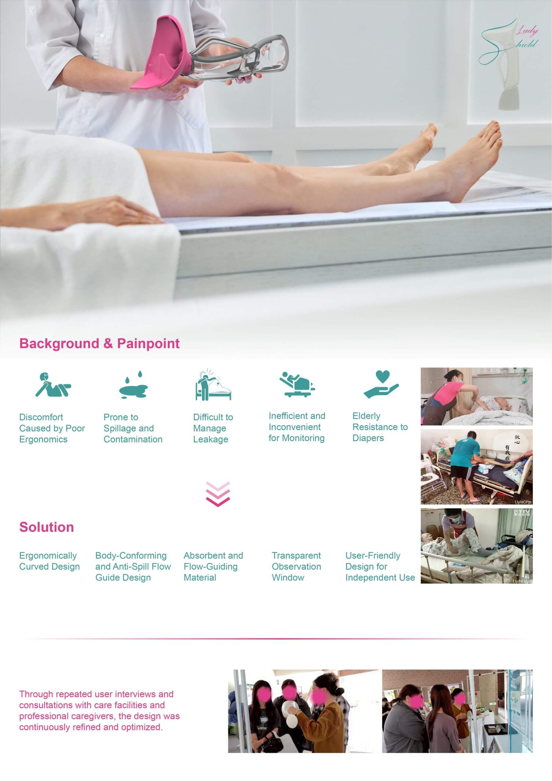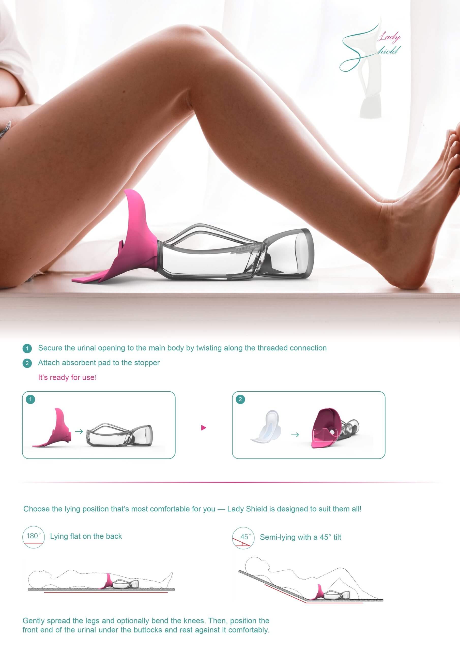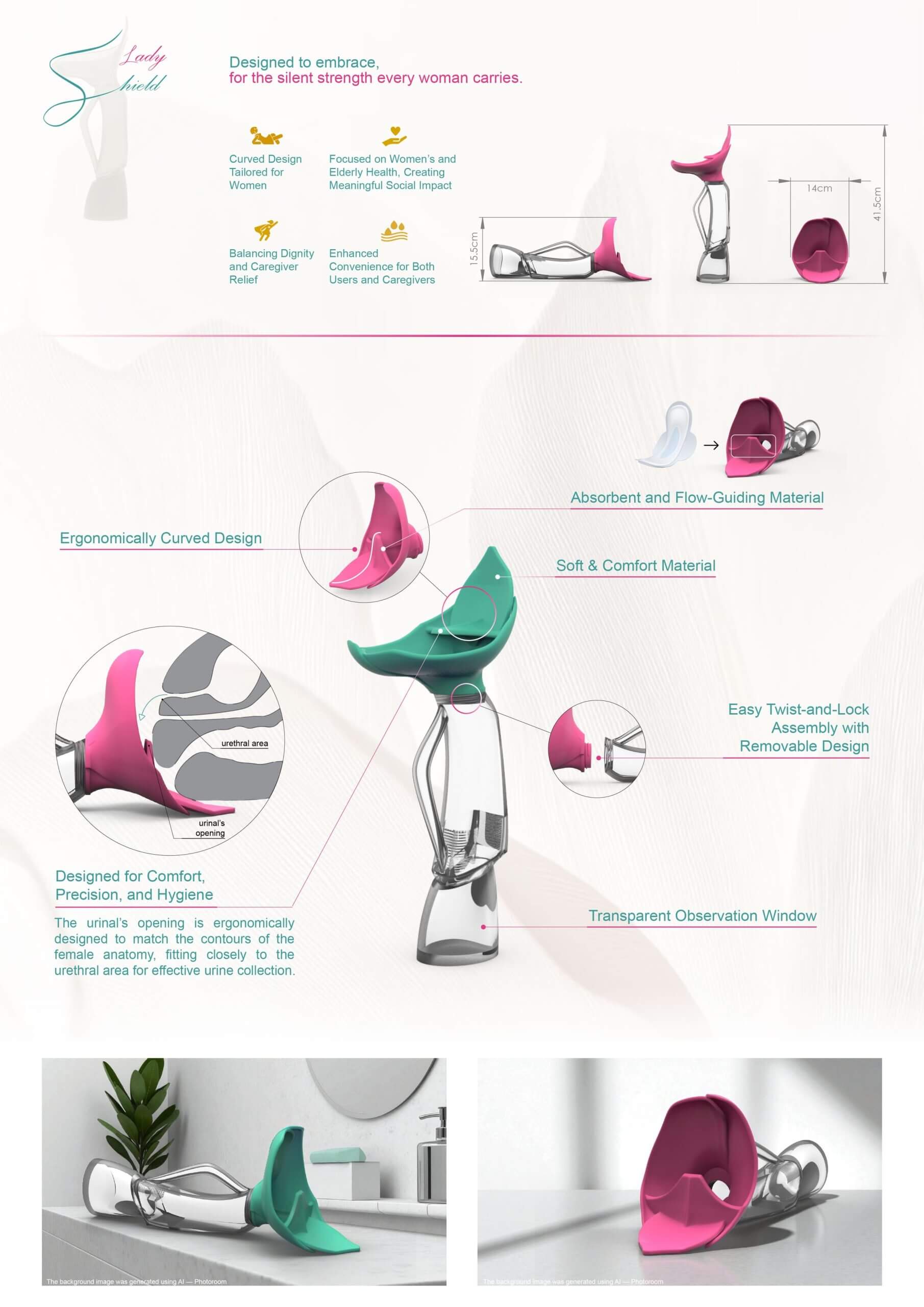 Most urination aids for women fail to consider ergonomic needs. Lady Shield is designed to follow the contours of the female lower body—particularly the pelvic area and urethral position. Its opening features a soft silicone cushion and a curved structure that fits closely to the skin, effectively covering private areas and preventing splashes or leaks. A removable absorbent pad captures residual urine, prevents backflow, making hygiene easier to maintain. The modular design allows for easy disa