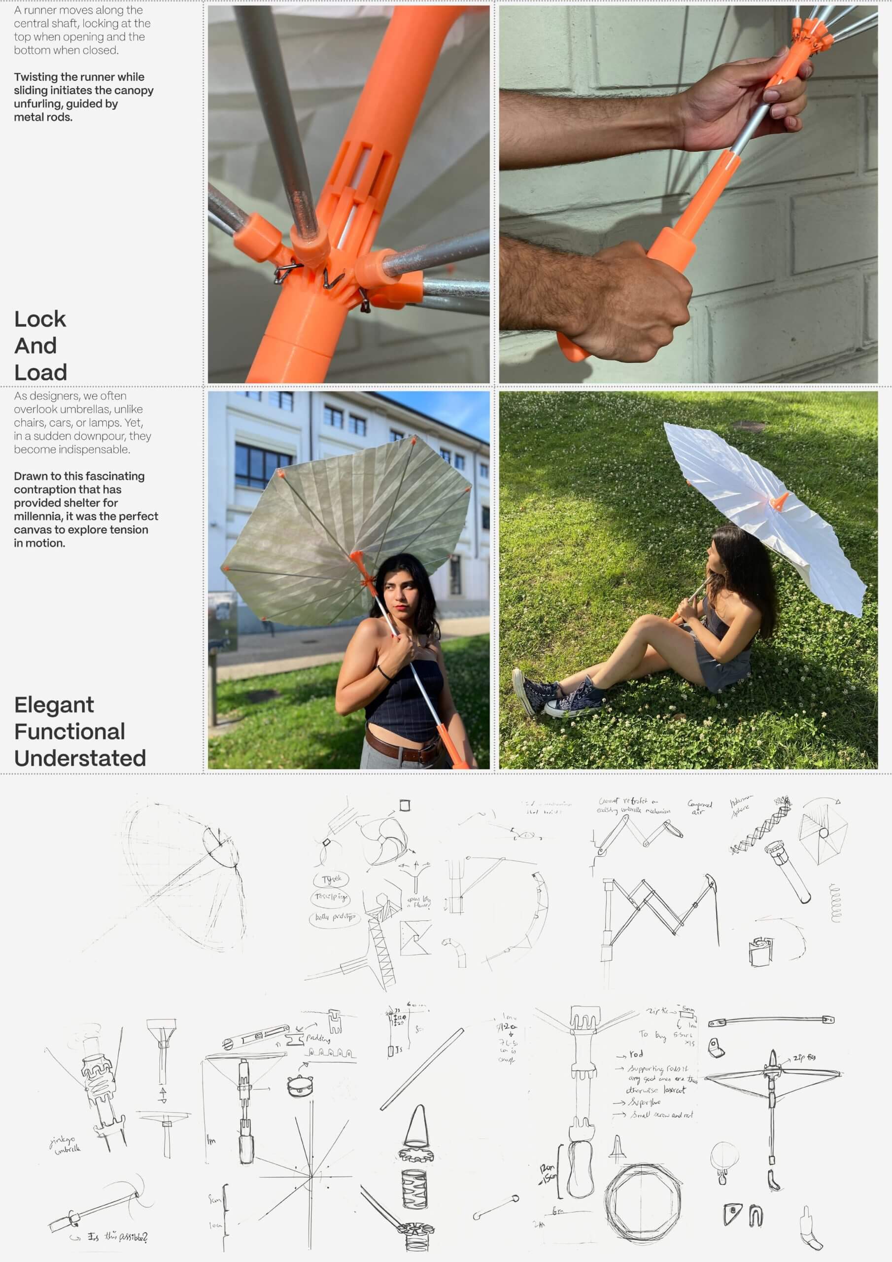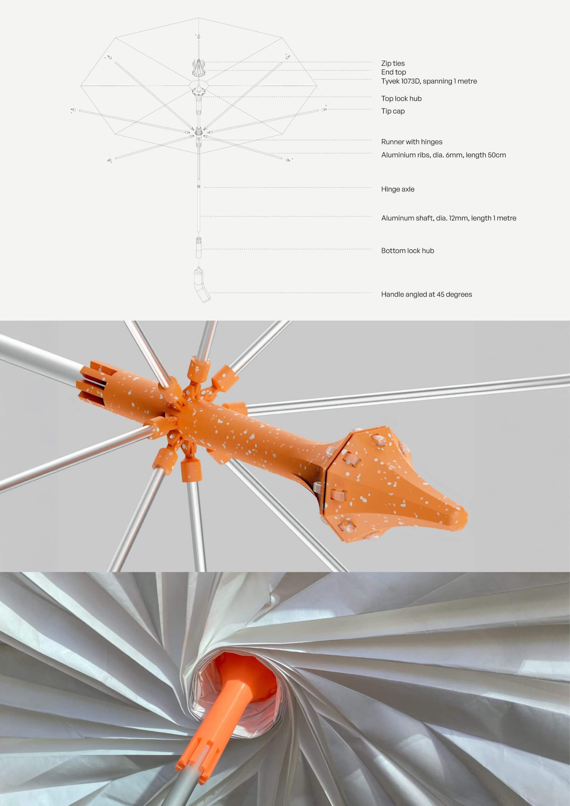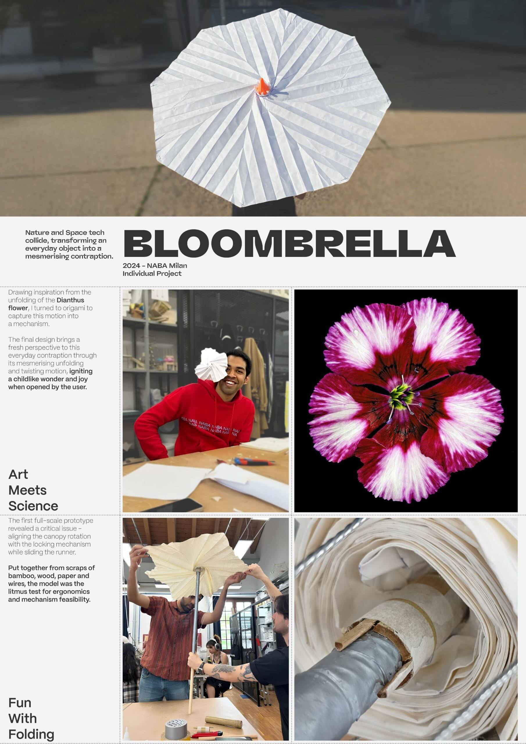 The aim was to capture tension in motion through the umbrella,an object of understated elegance and functionality. Drawing inspiration from the blooming of the Dianthus flower,I turned to origami to capture the swirling tension into a mechanism. Based on the design of satellite panels and after much experimentation and prototyping,the final design brings a fresh perspective to this everyday contraption through its mesmerising unfolding and twisting motion,igniting a childlike wonder and joy.