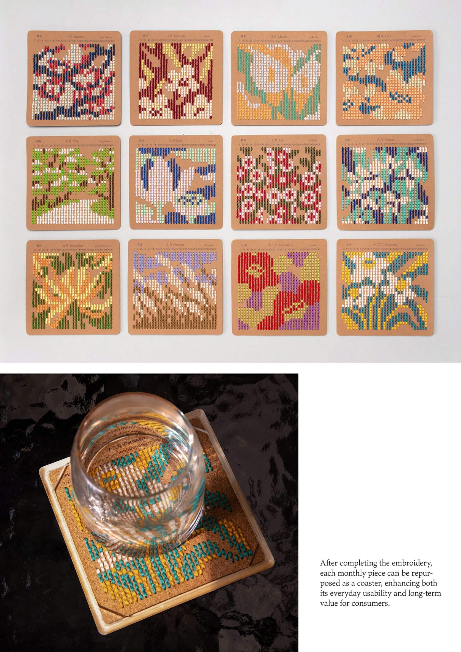 Threadays offers an alternative solution by combining simplified embroidery with a daily calendar. Inspired by a Buddhist belief: “A single flower holds a universe”, we selected twelve local seasonal flowers as our visual theme, each representing a different month. Through daily practice, the act of embroidery becomes a metaphor for blooming, symbolizing personal growth through steady and consistent participation.